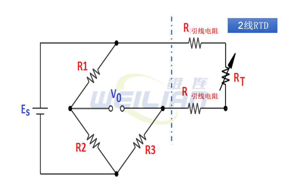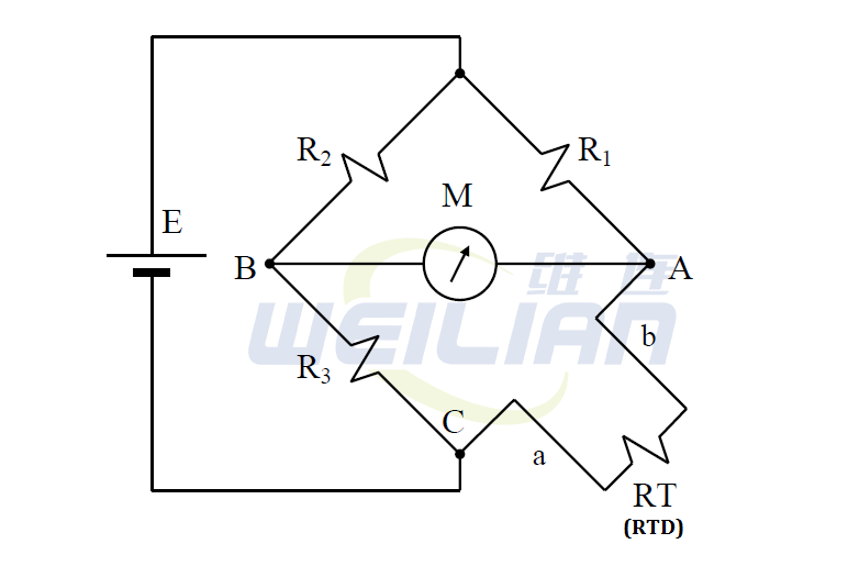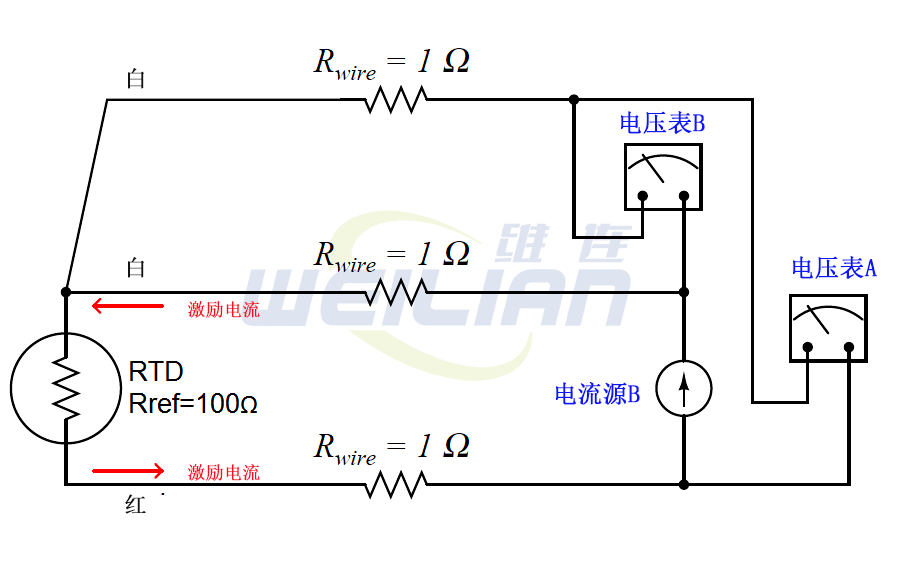 什么是三線 RTD溫度傳感器? 兩線和四線 RTD連接之間的折衷是三線連接,如下所示: 在三線 RTD溫度傳感器電路中,電壓表A測(cè)量 RTD 溫度傳感器的電壓降加上底部載流導(dǎo)線上的電壓降。