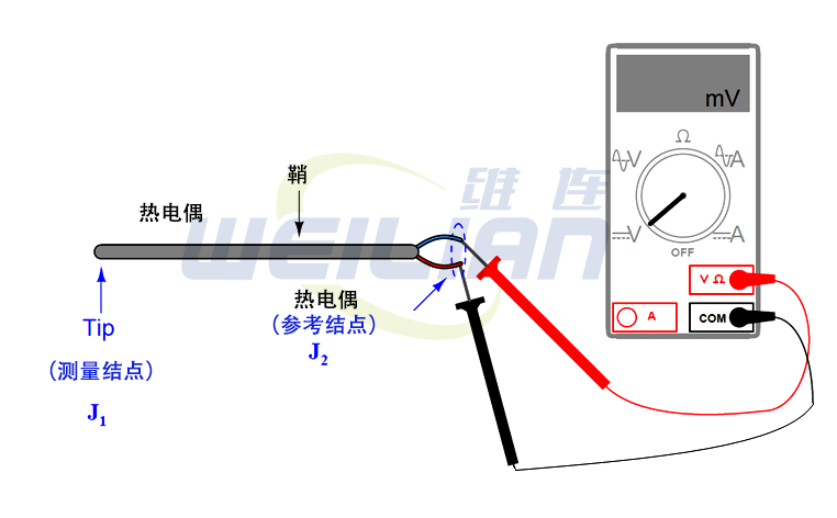 手動(dòng)解釋熱電偶電壓 連接到熱電偶的電壓表指示的電壓量是測量結(jié)(兩種不同金屬在我們希望感測溫度的位置連接的點(diǎn))產(chǎn)生的電壓與參比結(jié)產(chǎn)生的電壓之差(熱電偶線連接到電壓表線
