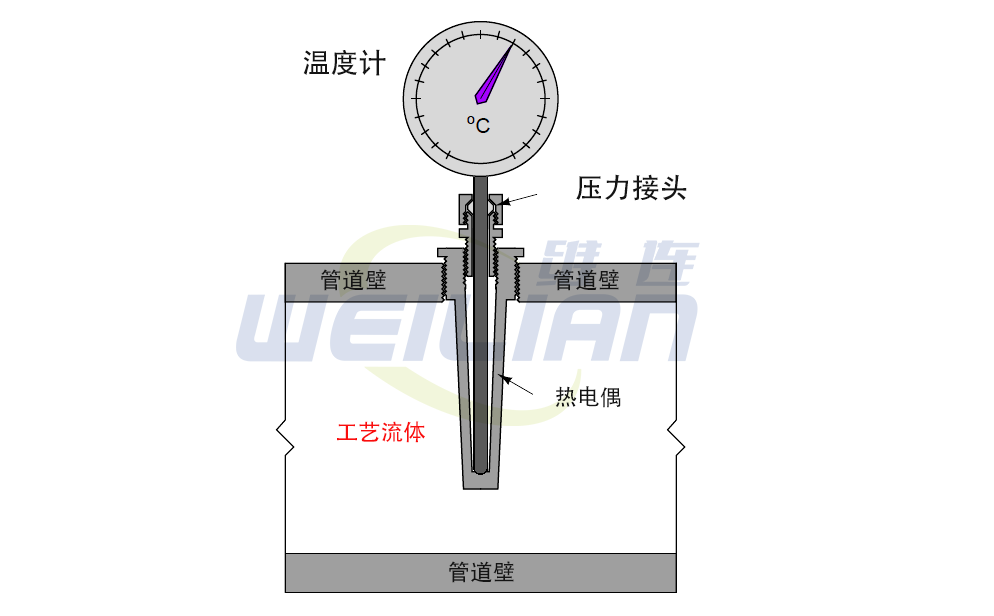 溫度傳感器配件 任何溫度傳感元件zui重要的附件之一是稱為熱套管的耐壓護(hù)套。這可以被認(rèn)為是過程容器或管道中的導(dǎo)熱突起,允許溫度敏感儀器檢測過程溫度,而無需在容器或管道上