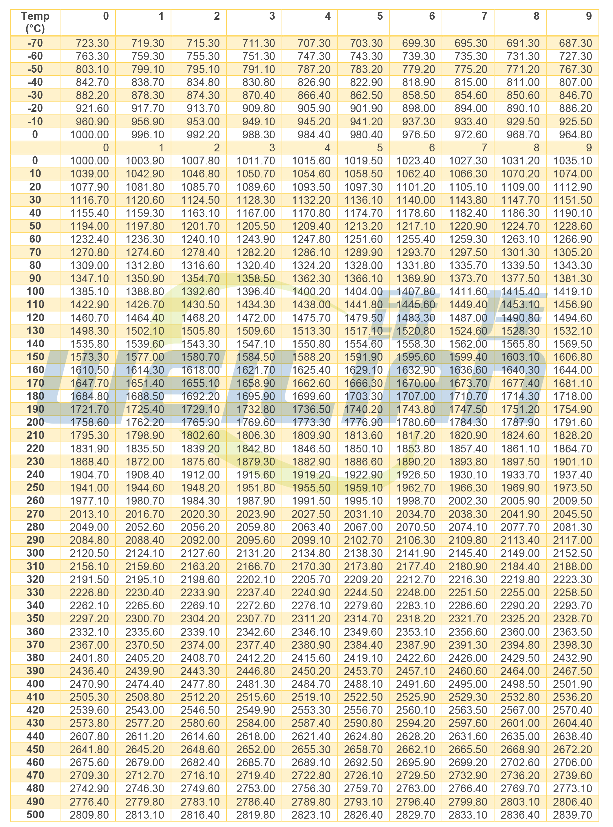 下圖可用作參考工具,以找出Pt1000 RTD 溫度傳感器的溫度范圍與電阻之間的關(guān)系??梢栽谧筝S下方找到十的倍數(shù)的溫度,而要獲得更精確的讀數(shù),您必須沿著水平軸在 1 到 9 之間移動。例如,Pt1000 在 126°C 時的電阻為 1483.30 歐姆。